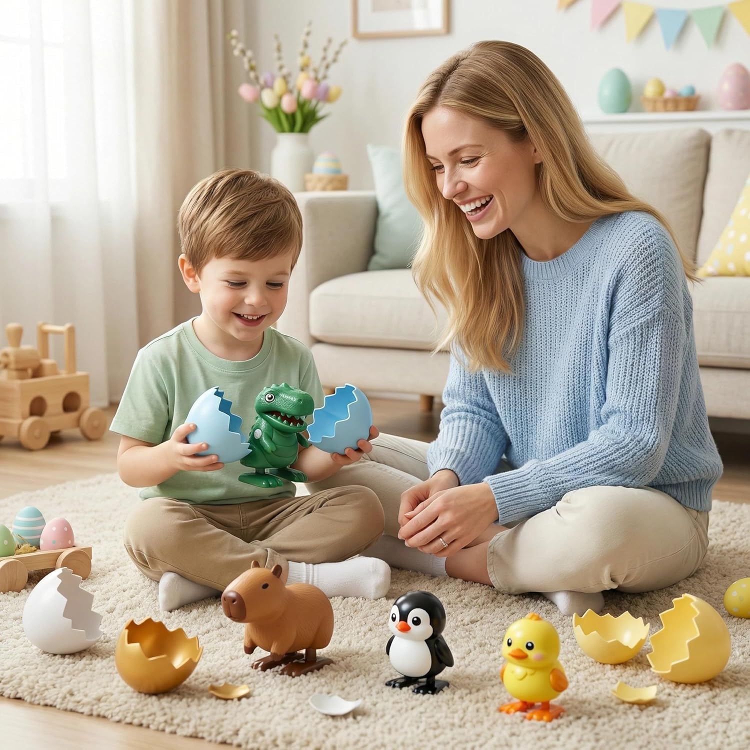 But the fun doesn’t stop there. With a quick twist, the tiny animal winds up and begins wobbling, rolling, or sliding across the floor, turning Easter morning into a hilarious race of bouncing penguins, waddling ducks, playful dinosaurs, and even quirky capybaras.